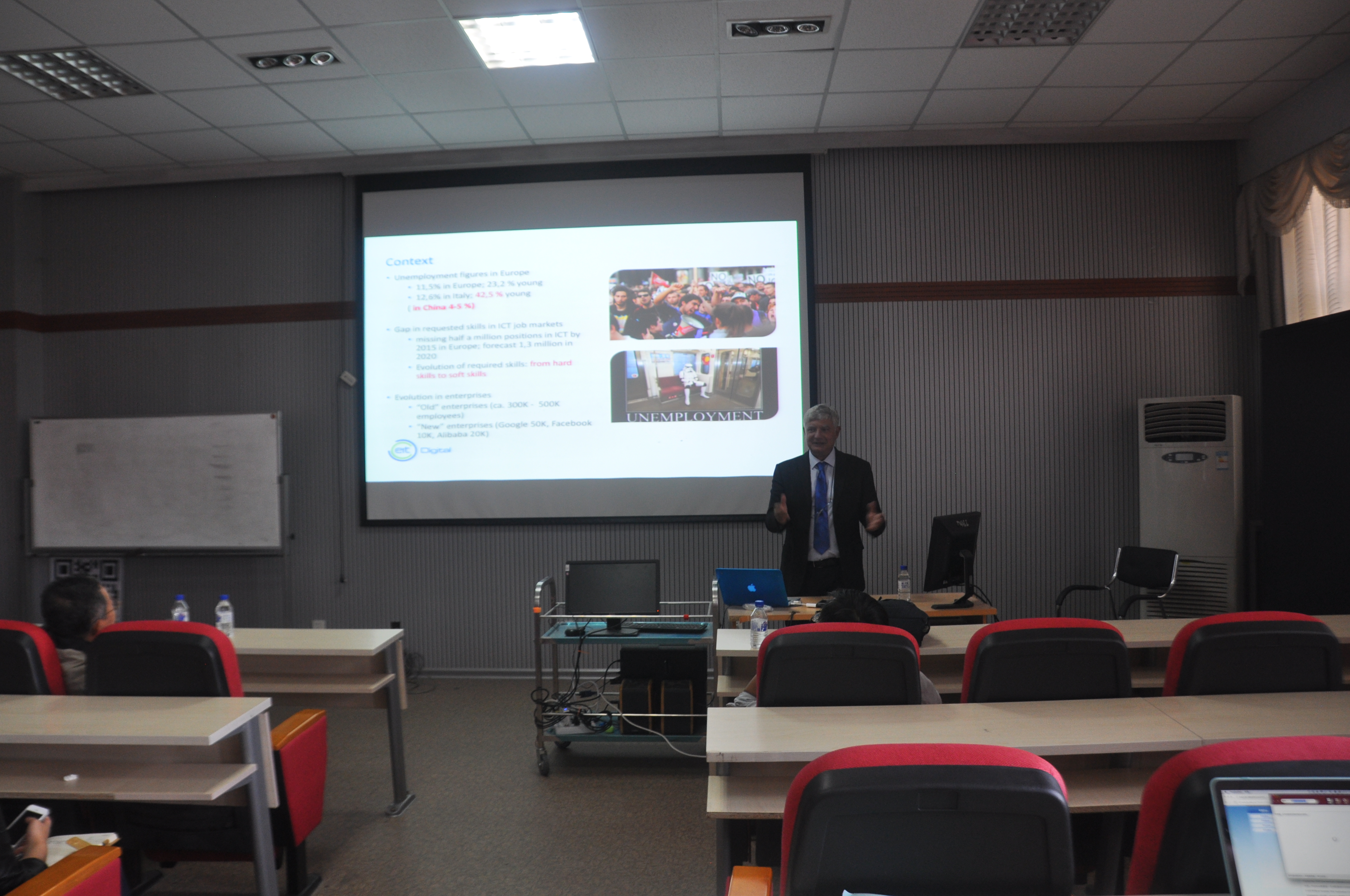 A521报告厅为计算机学院和软件学院的青年教师和研究生做了题为“Blending entrepreneurial education into engineering graduate programs”和“Active Aging”的学术报告。Marchese教授首先介绍了特伦托大学的研究生创新创业教育体系。针对研究生如何将所从事科学研究与企业需求相结合,博士研究生创业的有效途径等问题,进行了深入剖析。对于人口老龄化问题,Marchese教授分析了亚洲和欧洲的老龄化问题的共同点及不同点。针对该领域的当前热点研究方向进行了深入的分析,并对应用计算机技术辅助提高老年人生活质量的未来发展方向进行了预测。整个讲座得到了青年教师和研究生的积极响应。主讲结束后,Marchese教授回答了老师和同学们提出的相关问题。