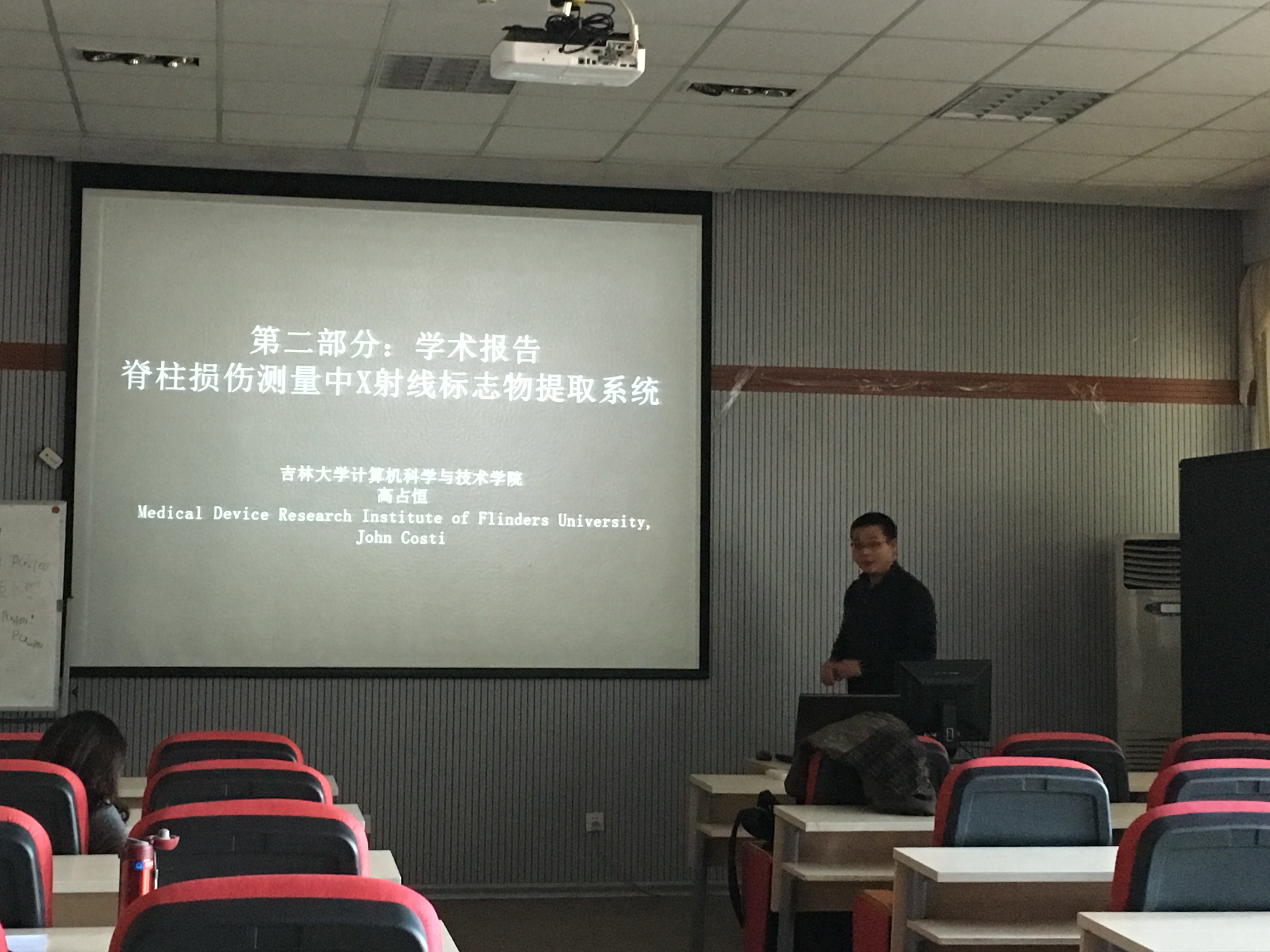 计算机学院高占恒副教授在计算机学院做了题目为“脊柱损伤测量中X射线标志物提取系统”的学术报告。报告主要介绍了高占恒副教授在澳大利亚从事访问学者期间,取得的一系列关于脊柱损伤测量中X射线标志物数字化的研究结果。报告中,高占恒副教授首先介绍了澳大利亚的工作、生活情况,然后介绍了脊柱损伤问题的定义、目前解决方案、本人在访学期间做的工作,着重介绍了其在访学期间研发的一款半自动X射线标志物数字化软件WireDig,包括软件的功能、特点,以及与原有软件相比的优势。