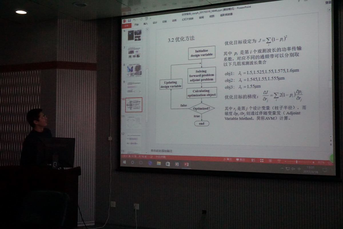 计算机学院曹英晖博士在计算机学院A515报告厅做了题目为“数值仿真与优化在光波导器件设计中的应用”的学术报告。报告主要介绍了曹英晖博士在美国访问学者期间的工作、生活经历,以及所取得的关于光波导器件数值仿真设计的研究结果。报告中,曹英晖博士首先介绍了中佛罗里达大学,外方合作导师Raj Mittra教授,以及访学期间的工作、生活情况,然后重介绍了其在访学期间所作的仿真计算方法研究工作,以及光子晶体耦合器和弯曲光波导的仿真优化设计工作。