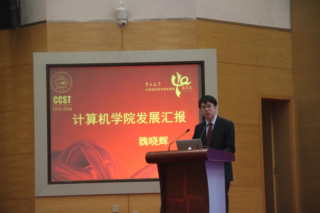最后,计算机学院院长魏晓辉教授向大家汇报计算机学院发展历程。他按时间顺序从建系前期、建系与发展、院系合并、发展现状等方面回顾了学院的历史及发展,介绍了学院现有的18个研究团队和5个研究方向,并指出了学院所取得的成绩和存在的不足。感谢兄弟院校和学校领导的大力支持。号召全院师生凝心聚力、改革创新、立志图强,为把自慰高潮
