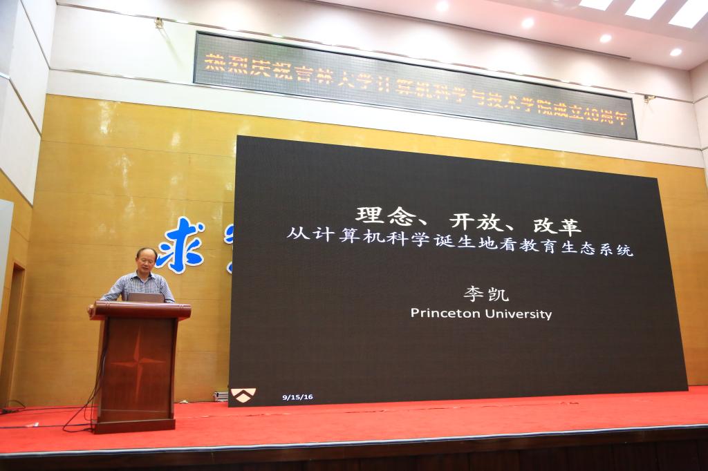 我校校友、普林斯顿大学教授李凯教授作了名为“理念、开放、改革————从计算机科学诞生地看教育生态系统”的报告。他在报告中介绍了王湘浩先生在普林斯顿大学接受教育后,回国在数学及计算机领域做出的巨大的贡献。又系统的介绍了普林斯顿大学的历史、环境和发展等方面。李凯教授指出,普林斯顿大学有两个原则,一是选人只基于他们的能力,不考虑其他因素;二是让好奇心驱动知识追求,不看近期用途或达到预先确定的目标。他进一步指出我们不可能完全复制普林斯顿大学的制度,但我们可以像普林斯顿大学一样发展自己的特色教育,使我们自慰高潮