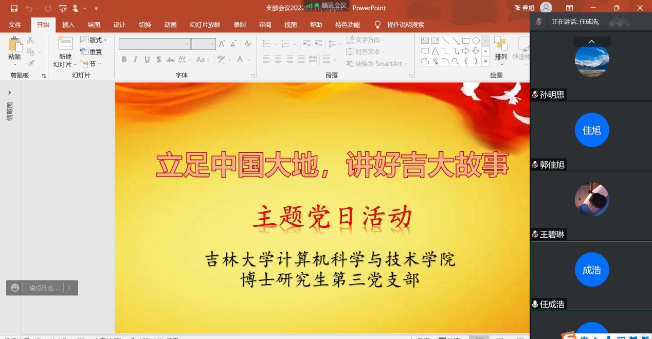 会议最后,支部委员对本次分享会进行总结,她呼吁大家照顾好自己,注意防护,有困难及时和组织沟通,大家互相帮助。面对疫情,信心比黄金更重要。在过去抗击疫情的大考、小考当中,我们有来自于党中央的坚强领导,有附属医院披坚执锐的“吉大力量”,有校园安全管理的“吉大智慧”,更有全校上下并肩守望的“吉大信念”。希望同学们提高科学认识,强化防疫知识,增强法律意识。振奋精神、坚定信心,不信谣、不传谣,不厌战、不旁观,牢固树立战胜疫情的底气、骨气、志气。这是对自身健康的最大呵护,也是对疫情防控的最大支持。疫情终将过去,春天必会到来!相信我们师生齐心协力,定将打赢这场没有硝烟的疫情防控阻击战。