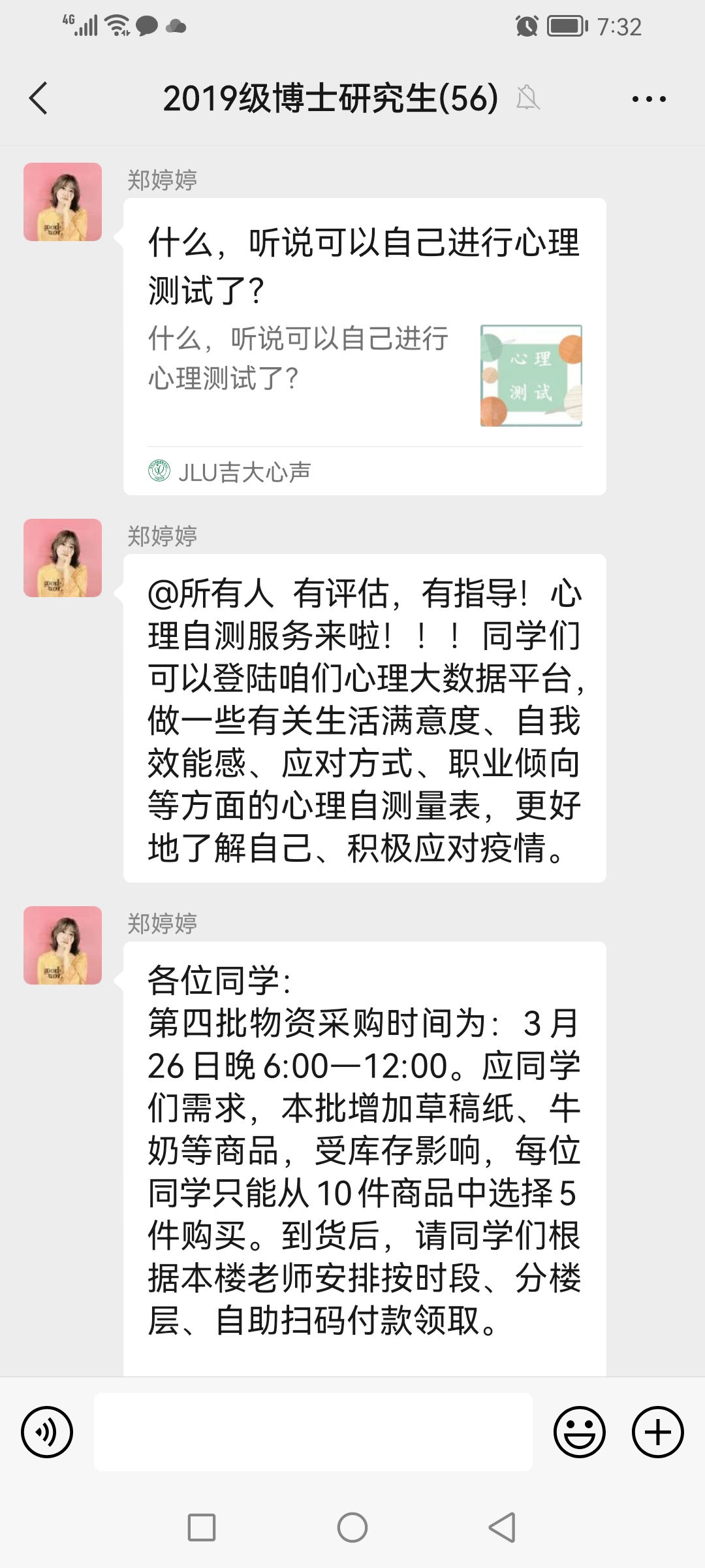 在本次党日活动正式开始之前,支部委员向支部各位党员发起了抗疫征文活动,请大家以自己的视角讲述看见的吉大抗疫故事。各位党员积极响应号召,踊跃发表自己最近一段时间的所见所想。会议伊始,支部委员向各位党员介绍了本次党日活动的主题,带领同志们学习了学校的疫情防控政策。随后对大家提交的征文进行了总结,在大家的征文中,都表达出了对学校、学院、志愿者和各项工作人员,在这段时间内对大家无微不至的关怀和照顾的感谢。此外,作为班长的胡俊成和郑婷婷也在征文中有很高的出镜率,他们每天都及时在班群里发布各类有关学生饮食、生活必需品采购、药品采购的相关信息,耐心周到地为大家服务,充分发挥了党员的先锋模范作用。