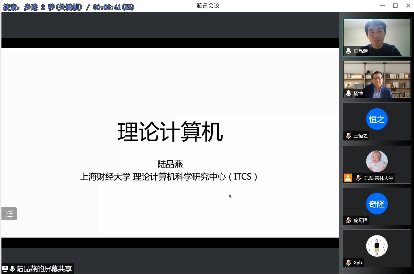 陆品燕,上海财经大学信息学院教授,理论计算机科学研究中心主任。2009年1月于清华大学计算机系获博士学位后加入微软亚洲研究院,历任理论组副研究员,研究员,主管研究员。2015年12月全职加盟上海财经大学,领衔组建理论计算机科学研究中心(ITCS),经过四年多时间的建设,他的研究中心在CSRankings上算法与复杂性方向已经排到亚洲第一名、全球前十。他的主要研究方向是理论计算机,并注重与其它学科的交叉,在理论计算机的三大会议STOC/FOCS/SODA共发表论文29篇。荣获ICALP2007、FAW2010、ISAAC2010 等重要国际会议最佳论文奖。担任FAW-AAIM 2012、WINE 2017、FAW 2018、ISAAC 2019等国际会议程序委员会联合主席,以及多次担任STOC,FOCS,SODA等顶级国际会议的程序委员会委员。曾荣获ACM杰出科学家奖(2019)、第八届世界华人数学家大会ICCM数学奖(原晨兴数学奖)银奖(2019)、中国计算机学会青年科学家(2014)、微软学者(2008)、清华大学特等奖学金(2007)等荣誉。