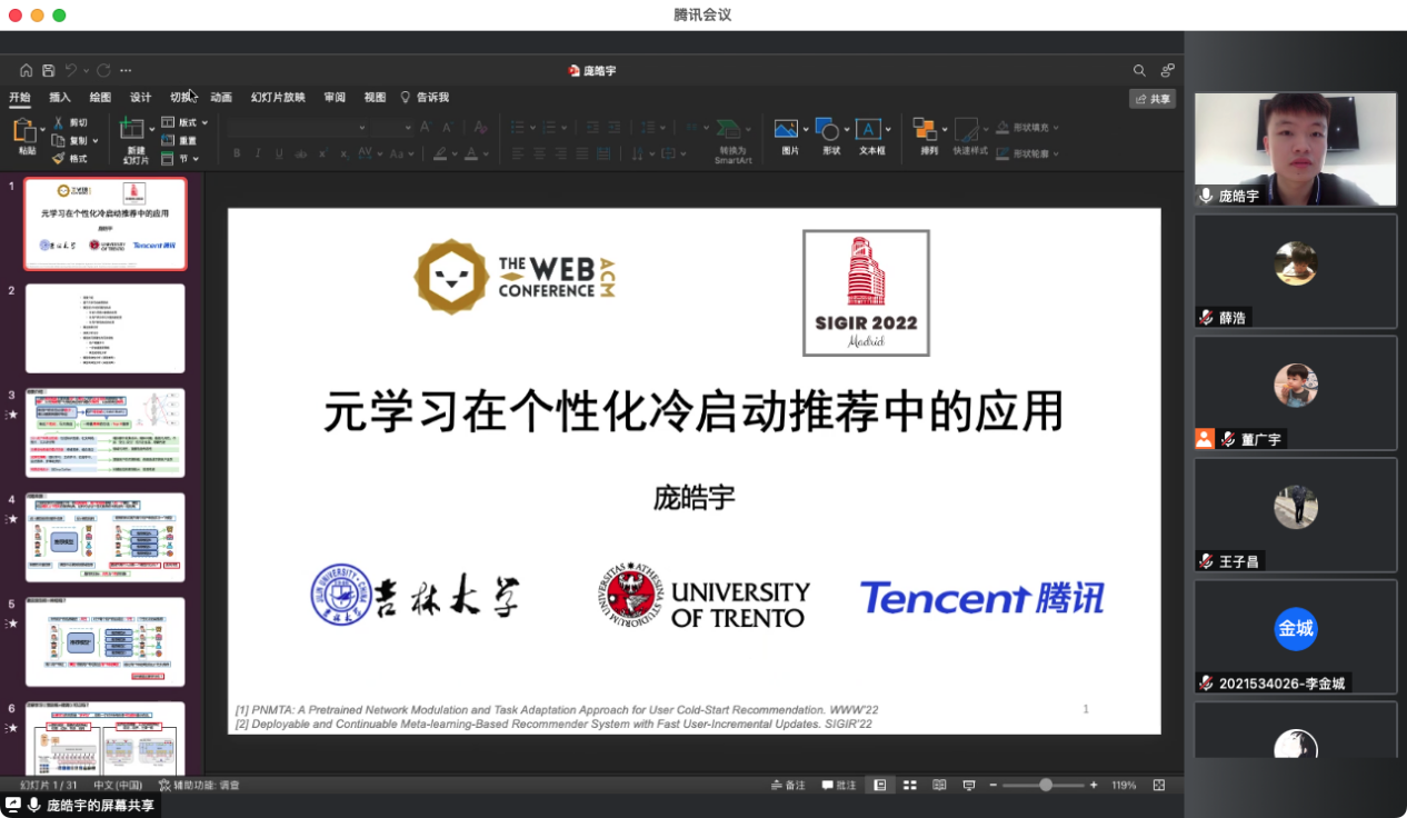 第二届“研学论道”研究生学术沙龙第一期(总第十六期)顺利举办。王喆副院长出席了本期活动,王院长回顾了第一届学术沙龙取得的丰硕成果,并对第二届的成果统计数据给予充分肯定。他表示,第一届学术沙龙活动在学院产生了积极反响,并营造了良好的学术氛围,本次成果统计仅在4个月时间就涵盖了14篇A类成果,这一学期,学院将赓续上一届的沙龙精神,继续邀请在学术上取得优异成绩的同学做学术分享,为我院研究生打造一个更好的科学研究与学术交流的平台。本期邀请了2020级硕士生庞皓宇和2020级硕士生刘永皓进行学术分享,他们分享的主题分别是“推荐系统”和“图表示学习”。本次分享由自慰高潮