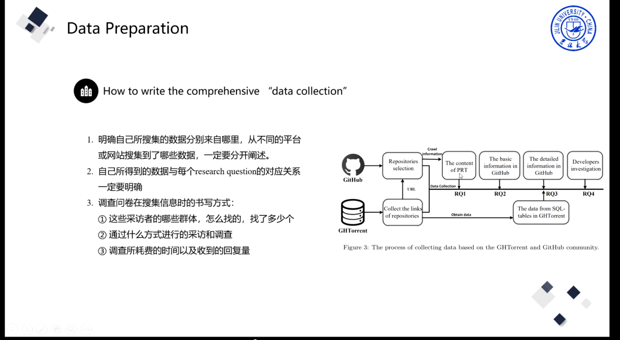 会议下半场,讲者张梦玺带来了以“Github社区信息挖掘”为主题的论文分享。讲者说道,为了规范化用户书写pull request的格式以对代码或文档修复,GitHub社区在2016年提出了Pull Request Template(PRT)的辅助工具,帮助开发人员更好地审查pull request,也帮助贡献者更好地书写pull request。但目前没有关于PRT有效程度的验证,即开发人员与贡献者是否愿意使用PRT。针对上述问题,讲者提出并解决了四个研究问题。第一,目前PRT的应用情况是怎样的,第二,有PRT的仓库之间有什么特点,第三,PRT的存在会对GitHub社区、仓库带来什么影响,第四,为什么只有很少的仓库愿意使用PRT。