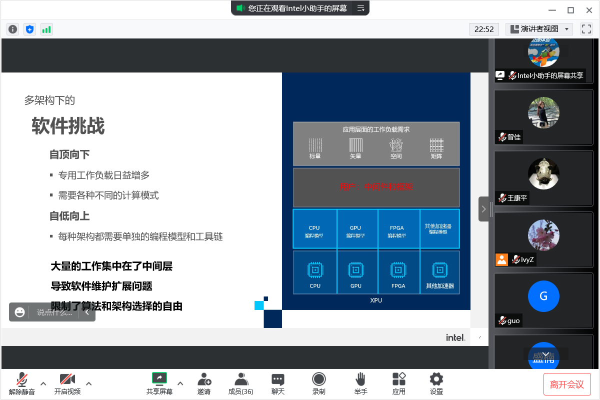 通过这次报告,老师和同学们对于英特尔异构计算框架oneAPI和统一编程模型有了整体的了解,理解了人工智能程序加速、移植、扩展的重要意义,并与赵鹏博士进行了深入专业的交流,进一步开阔了学术视野。