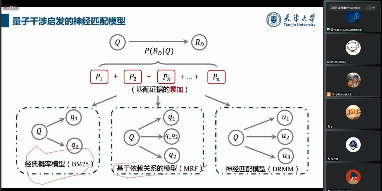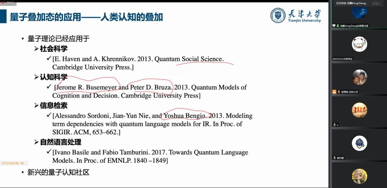 在讲座中,张鹏老师首先介绍了量子理论的基本知识,近年来,量子理论和人工智能的交叉研究越来越受人们的关注,量子理论已经逐步应用于社会科学、认知科学、信息检索和自然语言等领域。张鹏老师通过语言学中的“量子纠缠”现象--互文逐步介绍了量子理论启发的交叉领域研究(例如:量子信息检索、量子语言模型、量子多体启发的语言模型和预训练语言模型)。随后,针对自然语言的量子不确定性关键科学问题,介绍量子自然语言处理的前沿进展以及未来将面临的挑战。