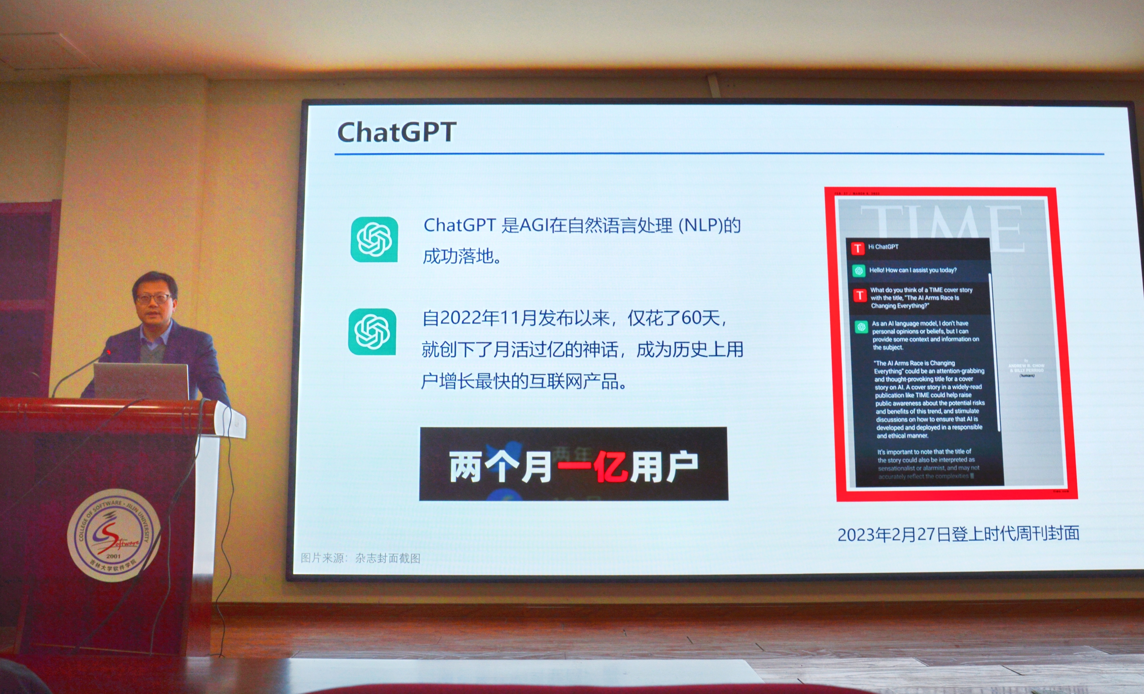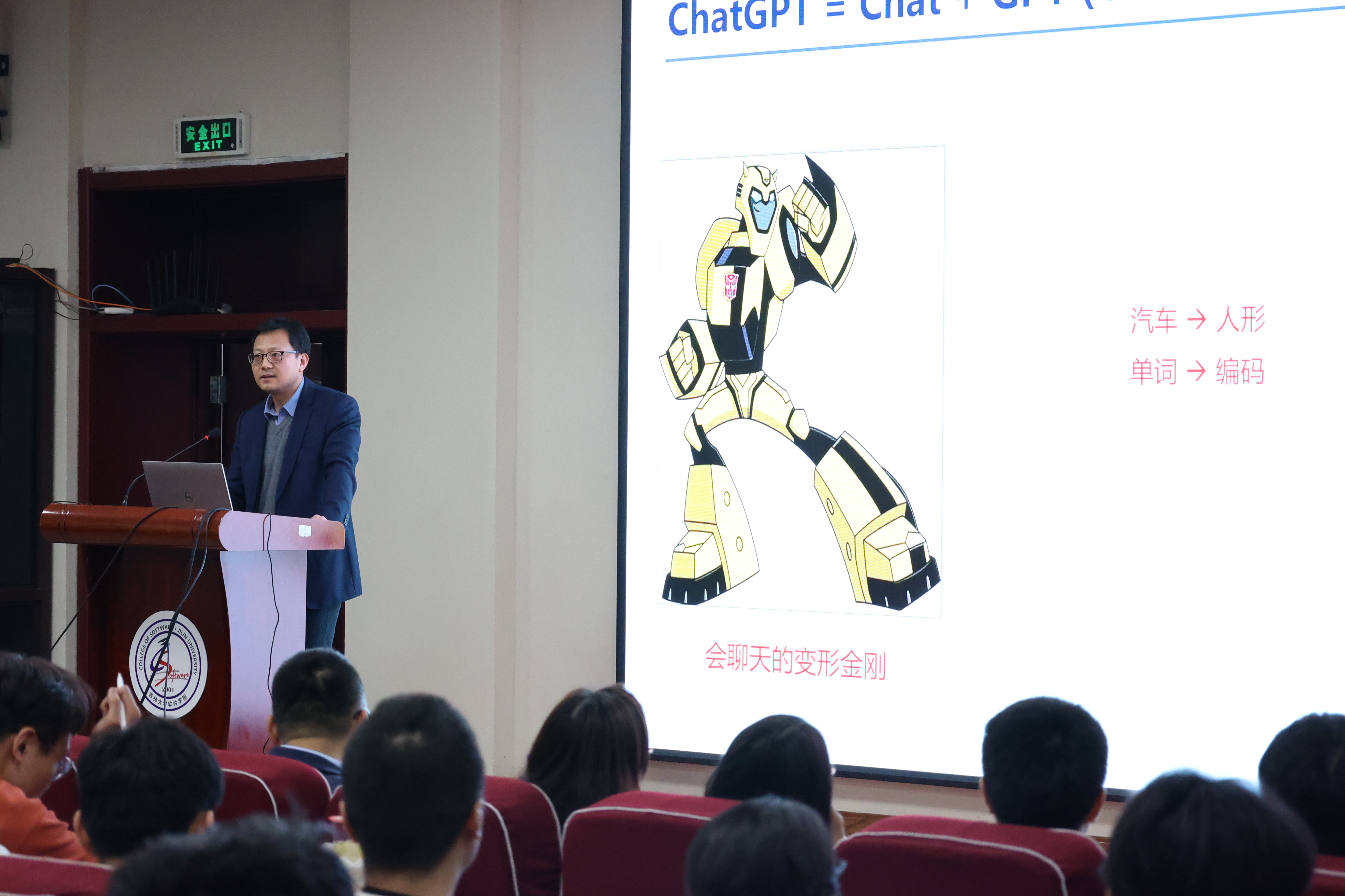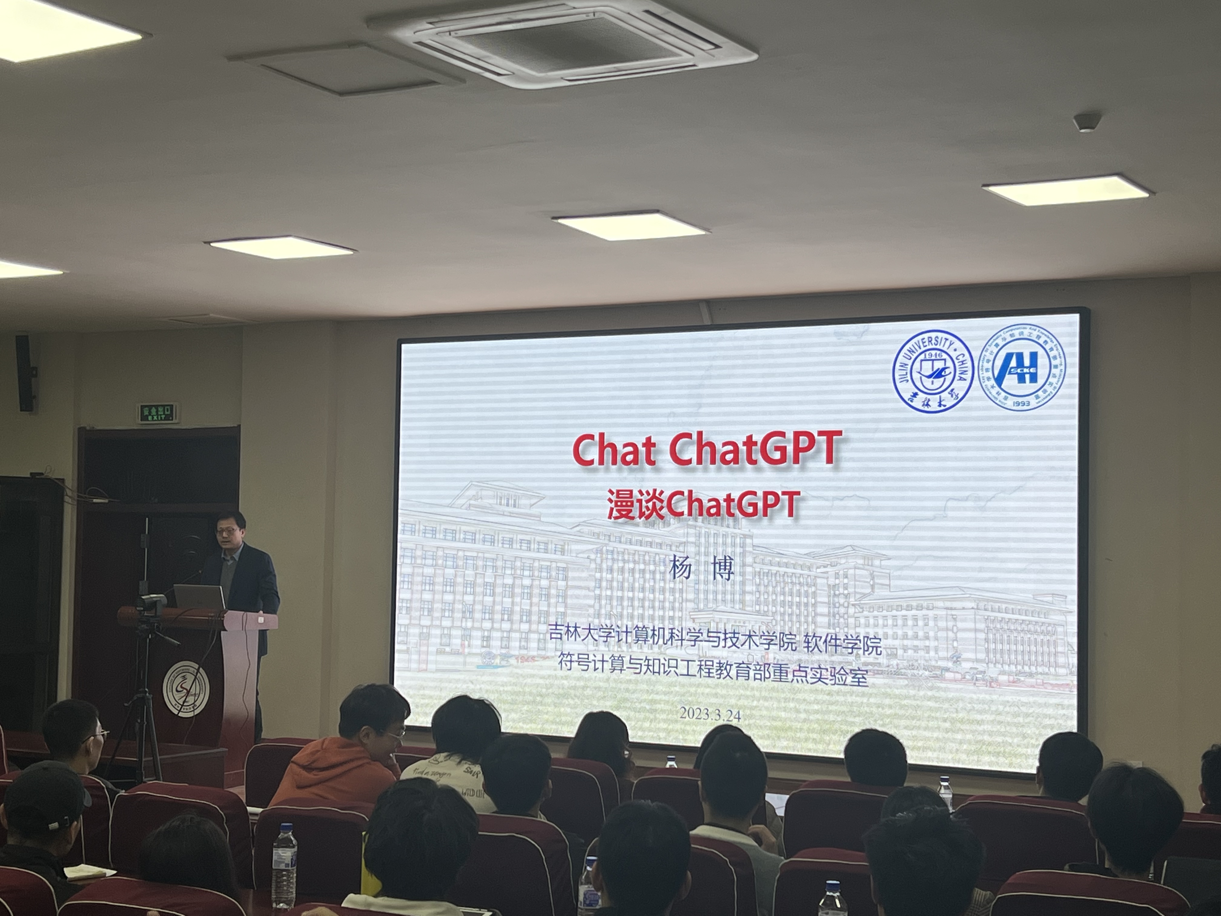 、软件学院院长杨博教授在王湘浩楼一楼大讲堂为两院学生主讲了题为《Chat ChatGPT》的学术讲座。在长达两个小时的讲座中,杨博院长通过针对性的案例结合人工智能在当下社会中的具体实践,将人工智能的演进史和ChatGPT的现状向同学们生动呈现。