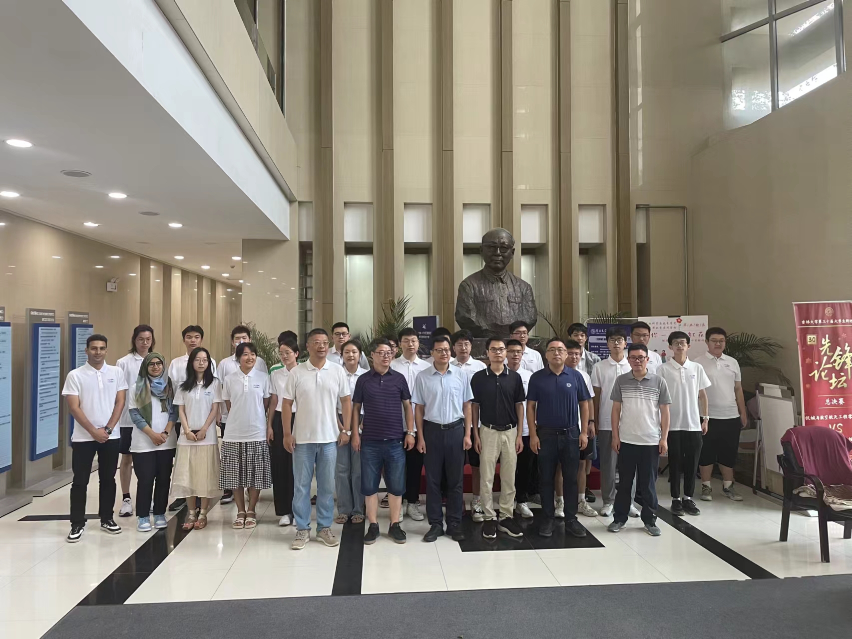 开班仪式结束后,杨博院长、张永刚副院长、张达鑫副书记、来自中科院软件所的蔡少伟研究员、李占山教授与同学们来到王湘浩先生纪念像前合影留念。