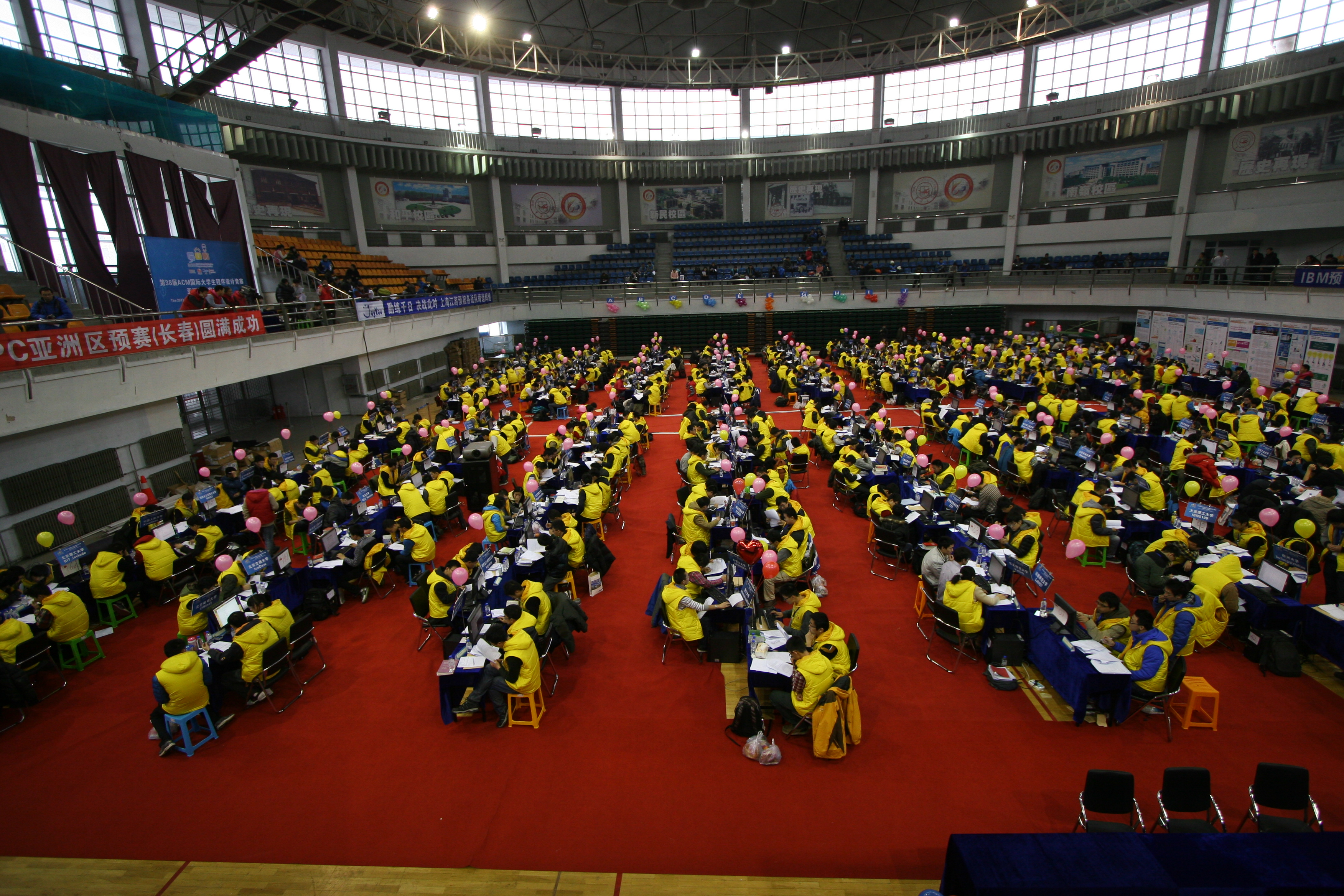 体育馆如期进行。每只队伍由3名队员组成,队员身着黄马甲在赛场比赛,教练身着蓝马甲在二楼看台观看比赛。比赛期间,每队使用1台电脑需要在5个小时内解决10道题,每道题对应不同颜色的气球,每答对一道题,身着红马甲的工作人员即在本队前方插上相对应颜色的气球。整个赛事紧张有序地进行。开赛仅2分钟,上海交通大学CamEo队解出了第一道题,获得第一个气球。随着赛事的推进,体育馆内彩球越来越多,场内气氛非常活跃。比赛进行到最后1小时赛事排名榜单停止了更新,场内气氛愈加激烈紧张,很多队员加紧了最后的冲刺。