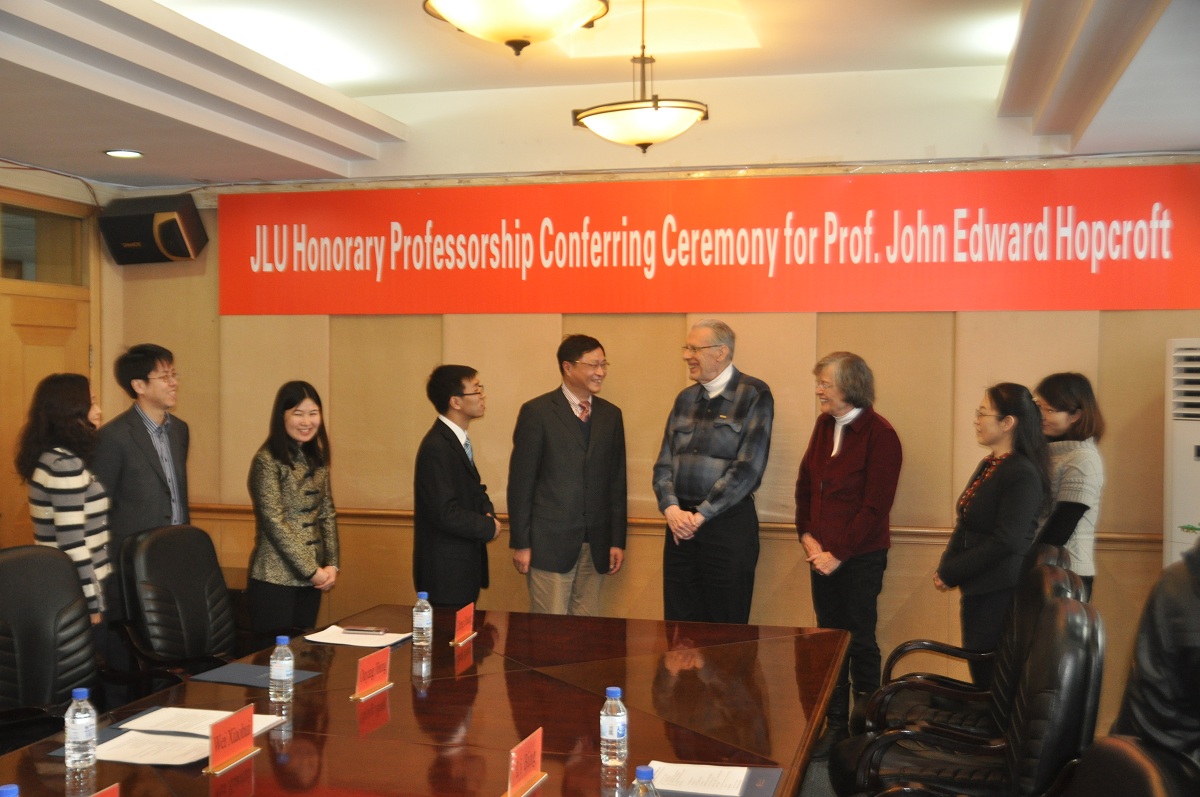 计算机学院部分师生的陪同下,简单了游览了长春市容。12月29日上午9点整,计算机学院院长魏晓辉同霍普克洛夫特教授在计算机楼咖啡厅进行了亲切会见,同时就目前计算机领域相关问题研究以及高效教育体制改革等多方面问题进行简短交流。9点30分,约翰•霍普克洛夫特(John Hopcroft)教授为学生进行了题为 “Future Directions in Computer Science Research”的精彩报告,报告中指出了在过去计算机科学研究过程中存在的很多问题和不足,同时也提出今后计算机科学研究领域应关注的几个重要话题。此次报告受到了广大师生的热烈欢迎,报告厅内座无虚席,同学们就自己感兴趣的方向向讲授提出了许多问体。