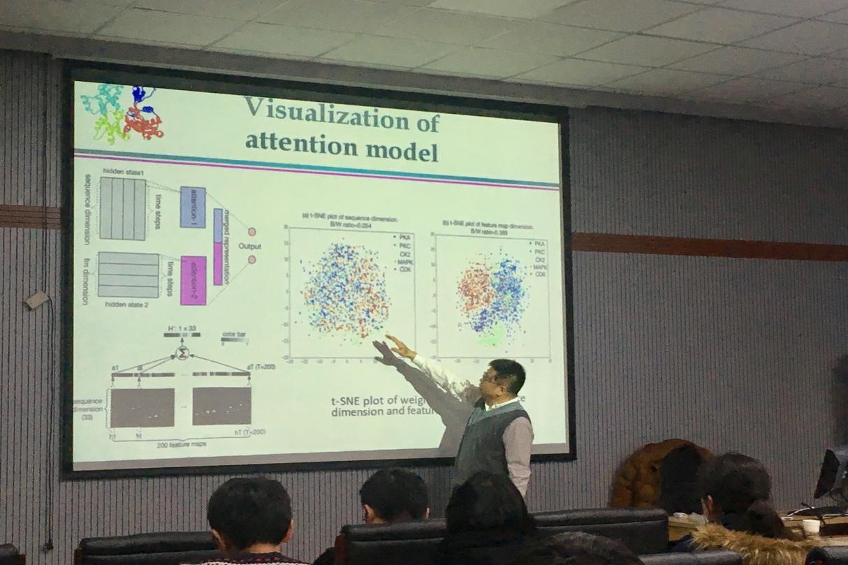 在本次报告中,许东教授从深度学习以及它在生物信息学中应用的概况出发,深入浅出的讲解了蛋白质二级和超二级结构预测、蛋白质域划分、蛋白质定位预测、蛋白质翻译后修饰位点预测、基因型-表型关系等问题,并讲解了这些问题中应用的深度学习方法,包括DNN、CNN、RNN、GAN、残差网络、胶囊网络等,以及在实验过程中使用的数据处理和特征提取的方法。此外,对于小数据、可解释等问题,许东教授介绍了他们团队的研究工作。在报告过程中,许东教授每讲完一个问题,就停下来和在场的老师同学交流,悉心回答他们提出的问题。报告最后欧阳继红副院长进行了总结,并鼓励在场师生瞄准学术前沿领域,深入钻研。本次报告受到了广大师生的热烈响应,不仅让大家增长了见识,也让大家对于深度学习在生物信息领域上的应用有了进一步的认识。