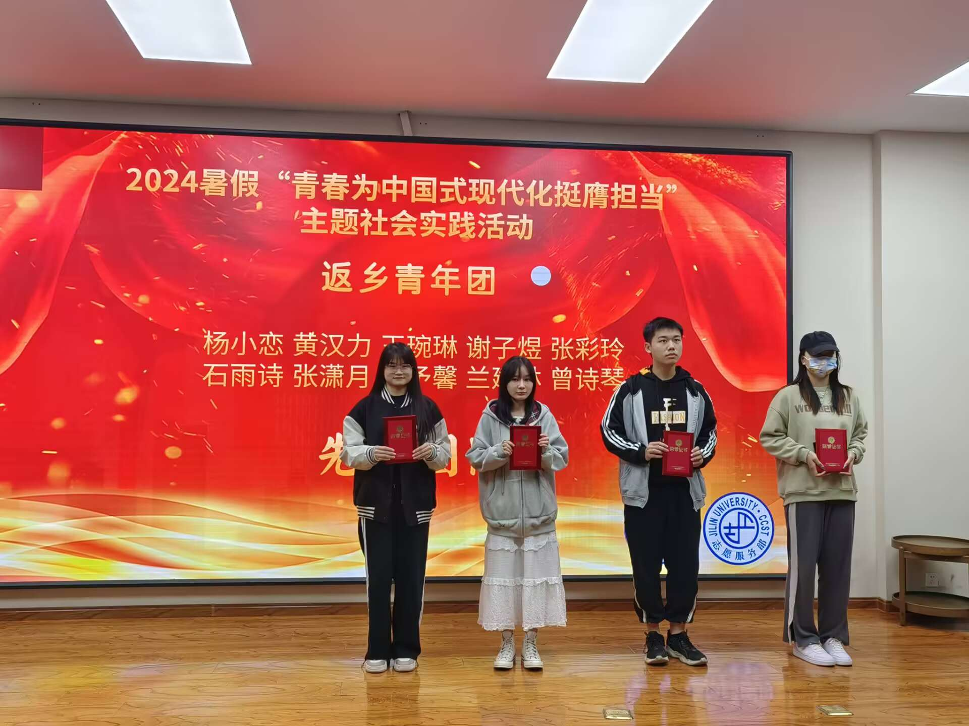 学生会志愿服务部代表给五个先进团队颁奖。