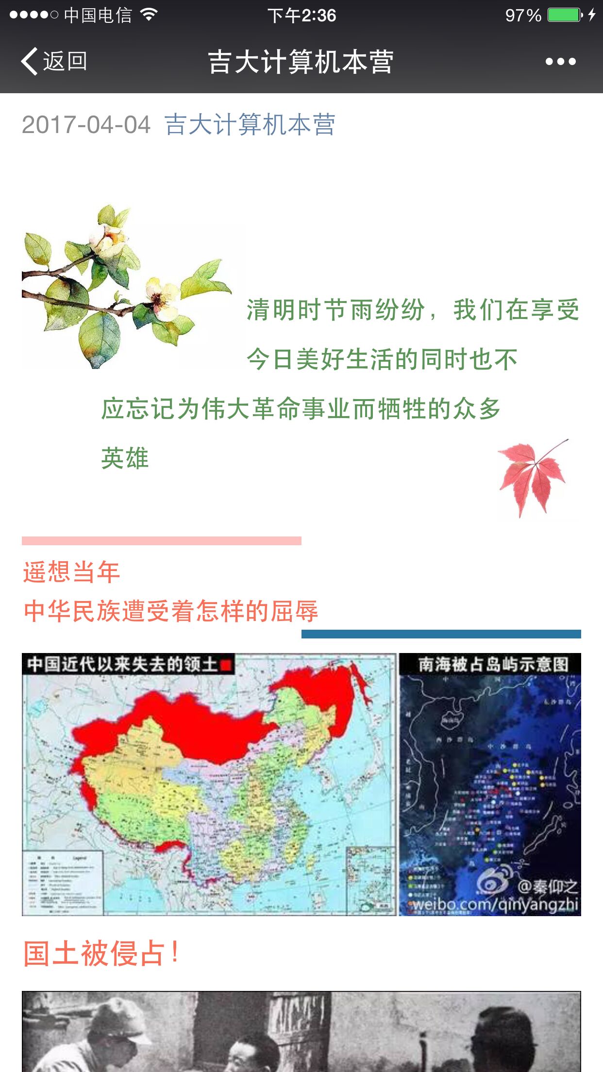 计算机学院于南湖公园进行清明祭扫活动的同时,计算机学院信息部在“吉大计算机本营”微信公众号上推送了一篇关于倡导清明节追悼先烈活动的文章。该文章一经发布,随即获得全校师生的广泛关注。